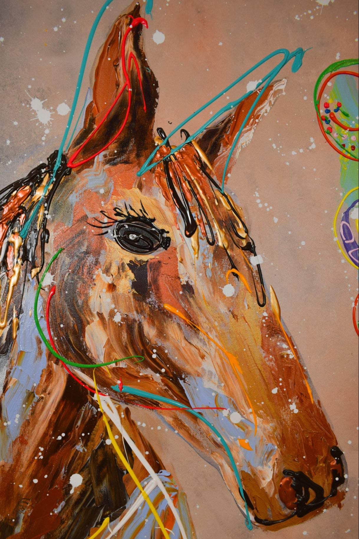 Het gebruik van frisse, heldere tinten zorgt ervoor dat moderne kunst paard direct je aandacht trekt. De achtergrond heeft abstracte patronen. Die versterken het expressieve effect van het schilderij. Dit past goed in moderne en minimalistische woonruimtes.